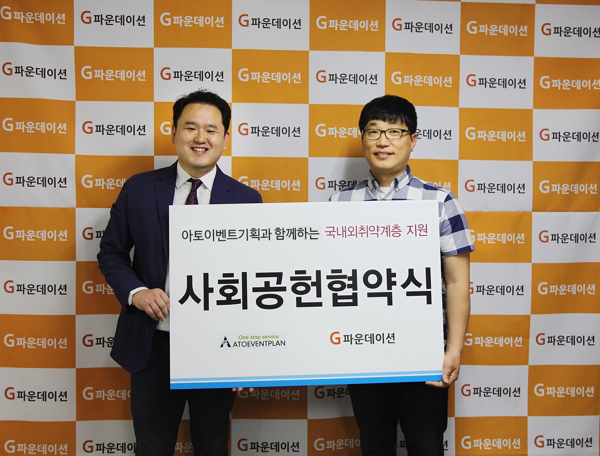우리단체는 지난 7일 아토이벤트기획과 사회공헌협약식을 가졌습니다. 이날 협약식에는 우리단체 박충관 대표, 아토이벤트기획의 김영삼 대표 등 양기관의 임직원이 참석했습니다. 아토이벤트기획에서는 지파운데이션의 국내외 취약계층지원을 위한 온,오프라인 캠페인 공동기획 및 인프라지원 등을 통해 소외된 이웃에게 희망을 전할 예정입니다. 소중한 나눔을 실천해 주신 아토이벤트기획에 감사드립니다.