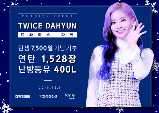작년에 이어 트와이스 다현 팬모임 '다현갤러리'에서 연탄 1,528장과 등유 400L를 기부해 주셨습니다. 감사합니다! 짝!짝!짝! 다현양의 탄생 7,500일(12월 8일)을 기념하여 다현양의 생일을 상징하는 연탄 1,528장과 함께 난방용 등유를 독거노인, 장애인가정 을 위해 기부했습니다. 기부된 연탄과 등유는 동부희망케어센터를 통해 남양주지역 취약계층 6가정에 전달되었습니다.