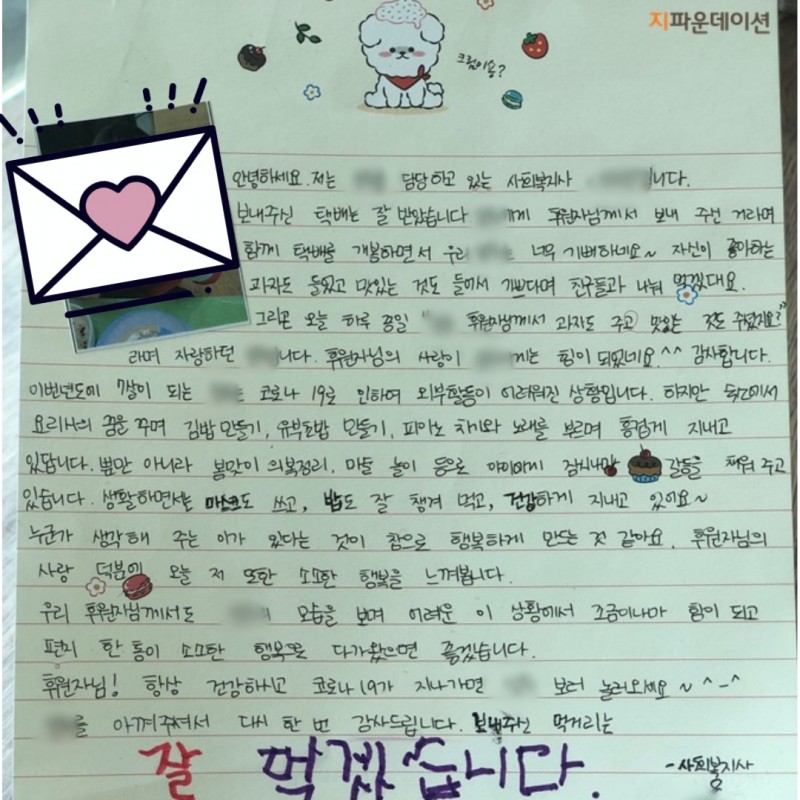 코로나19의 위험이 모두 사라질 때까지 후원자님 모두 건강 조심하시길 바랍니다.