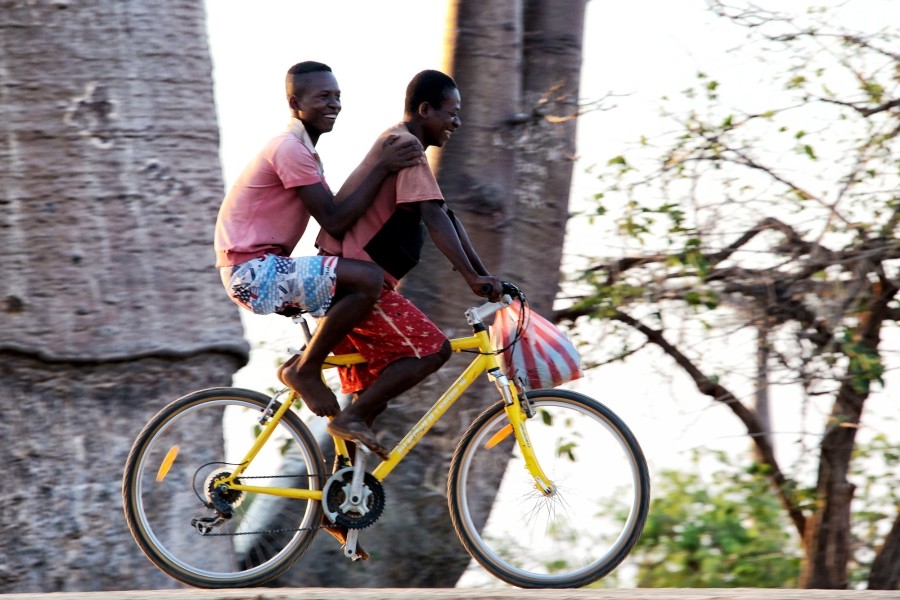 바오밥 나무 사이를 달리는 자전거와 두 남자.
